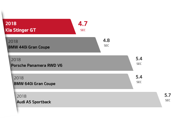 Go 0-60 mph in as low as 4.7 seconds. With up to 365 horsepower and 376 lb.-ft. of torque. The 2018 Stinger GT is the new grand touring that takes you farther, faster.